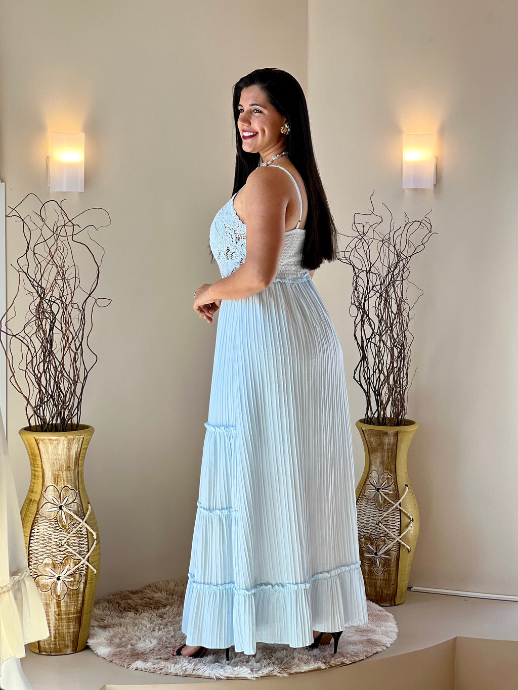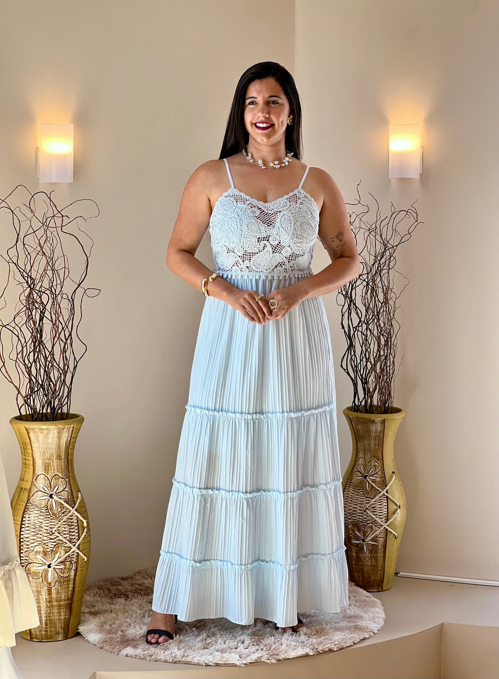 O destaque deste vestido está no seu busto, todo bordado com delicados detalhes que trazem um toque de feminilidade. Além disso, ele possui bojo, garantindo um caimento perfeito e valorizando ainda mais o seu corpo.